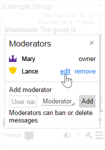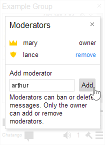 Moderators can ban users and delete messages, and perform other group administrative tasks, depending on their permission levels. We suggest that you make enough moderators so that there's always a moderator in a chat over 300 people. To make new moderators you must be logged in as the owner or administrator and click Moderation menu Add/remove moderators.