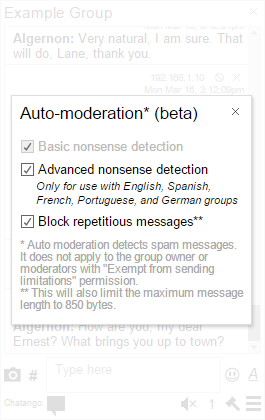 Auto-moderation uses machine text analysis to detect and reject repetitious or nonsense messages. It should work with all languages, including character based. You can access this menu as the owner or a moderator by clicking Moderation menu Auto-moderation.