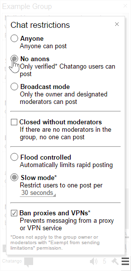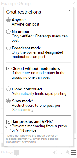 Prevents messaging from a proxy or VPN service. Log in to your group as the owner. Click the Main menu then choose Chat restrictions and choose Ban proxies and VPNs.