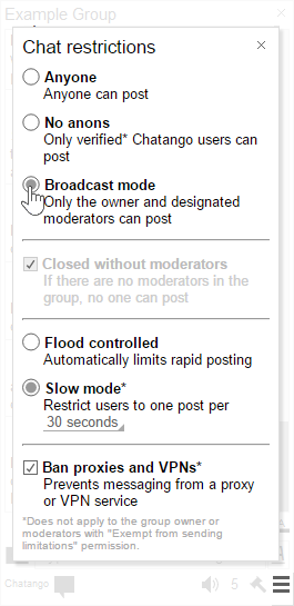 Only the owner and designated moderators can post. Use this mode for interviews, live blogging etc. Log in to your group as the owner. Click the Main menu then choose Chat restrictions and choose Broadcast mode.