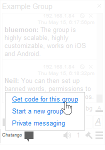 If you need to get HTML code again to put your group on another web page, click on Chatango logo at the bottom of your group, and choose Get Code for this Group from the menu.